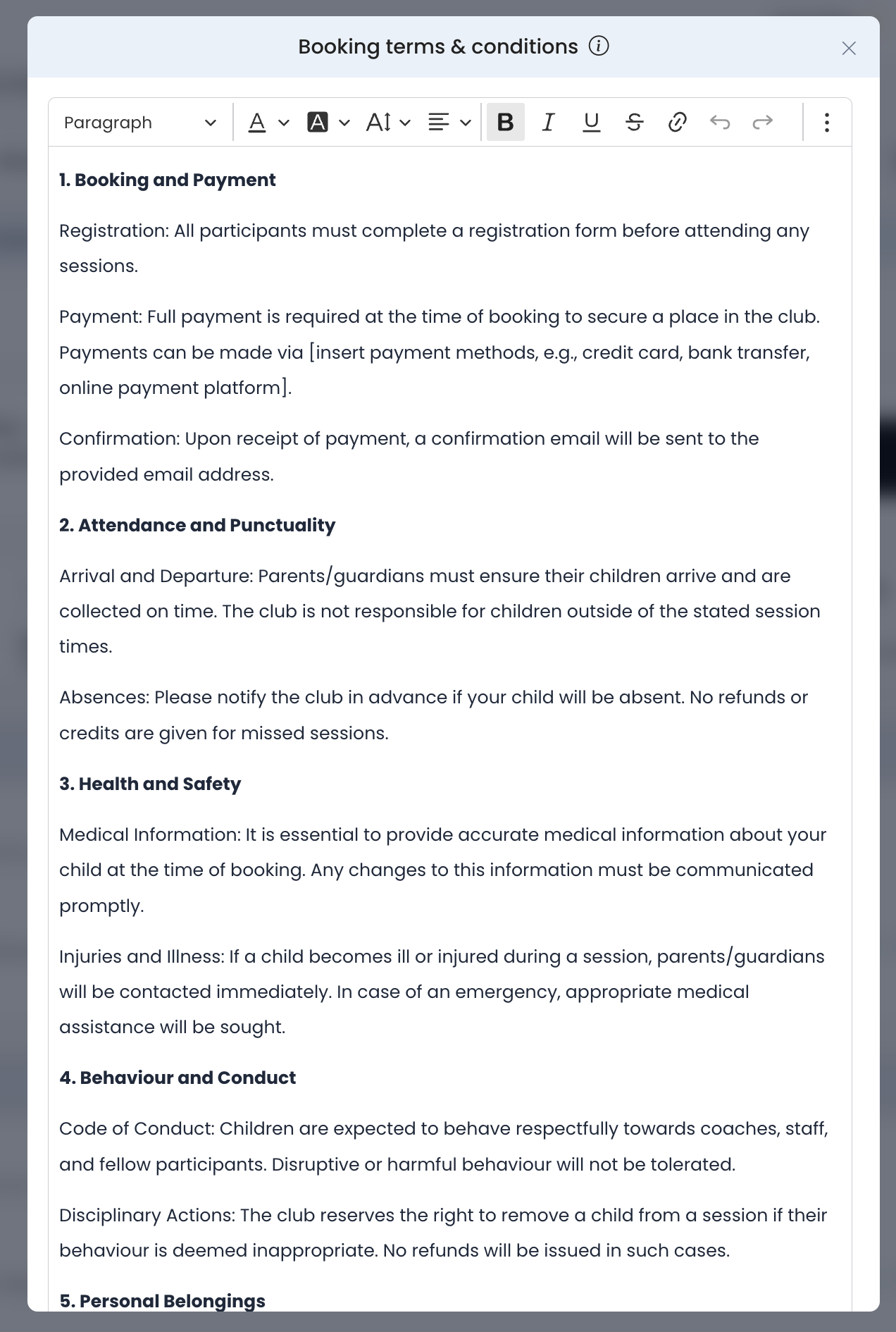Tip: Keep your terms concise and easy to understand — this ensures customers know your expectations before confirming a booking.