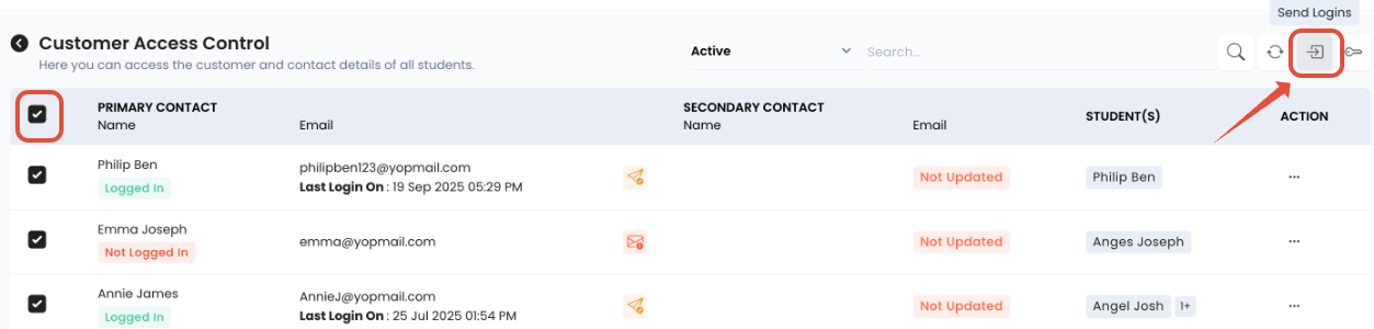 In the Customer Access Control page, tick the box next to each customer you want to invite — or click the Select All checkbox at the top to select everyone.